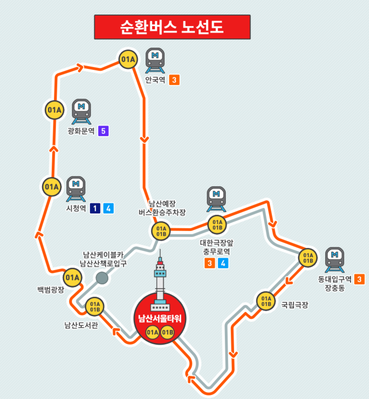 버스를 타고 앉아서 남산타워까지 편하게 가시고 싶으신 분은 지하철연계 탑승장보다는 출발지인 남산예장버스환승주차장에서 타셔야 한다는 것을 알려드립니다. 남산예장버스환승주차장은 명동역 1번 출구에서 반대방향으로 가면 3분이면 도착하는데, 네이버지도에 검색하면 오르막길로 알려줍니다. 힘들게 오르막길 오를 이유 없이 쉽게 가는 방법이 있습니다. 빨간 오르막 길을 오르지 마시고 짧은 횡단보도를 건너 오른쪽 방향 터널 같은 곳을 통과하면 아주 쉽게 순환버스 출발지에 도착합니다. 참고로 남산예장버스환승주차장은 승용차는 주차 불가한 대형버스 전용 주차장입니다.