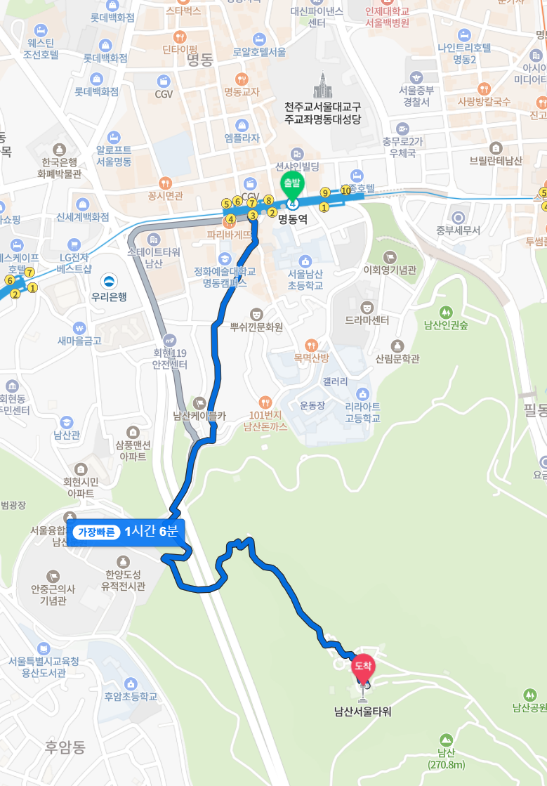 남산 서울타워로 올라가는 방법은 첫 번째 도보, 두 번째 남산케이블카 타기, 세 번째 버스 타고 올라가기입니다. 걸어서 가는 방법은 우선 명동역까지 지하철을 타고 이동해서 3번 출구로 나와 올라가면 되는데 남산타워까지 대략 1시간 정도(1.7km) 소요되는 코스입니다. 도보로 갈 경우 명동에서 출발하는 코스는 무한의 계단이 이어지므로 체력이 뒷받침되지 않지만 그래도 걸어서 남산을 가고 싶다면 차라리 언덕길의 연속인 동대입구 출발 코스를 추천합니다. 시간은 대략 1시간 정도로 비슷하지만 계단보다 언덕길을 걸으며 힘들면 지나가는 순환버스를 탈 수도 있기 때문입니다. ^^