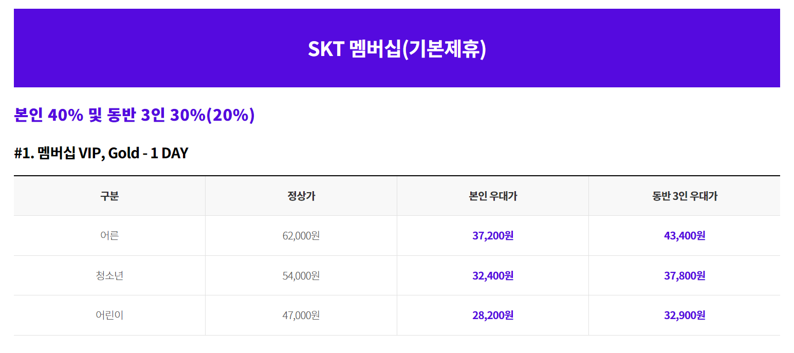 SK텔레콤 T멤버십의 경우 최대 40% 할인을 받아 37,200원에 자유이용권을 구입할 수 있습니다.