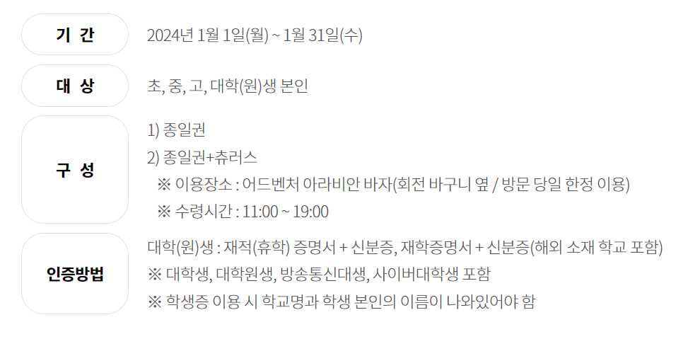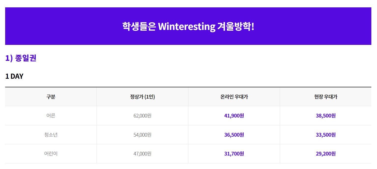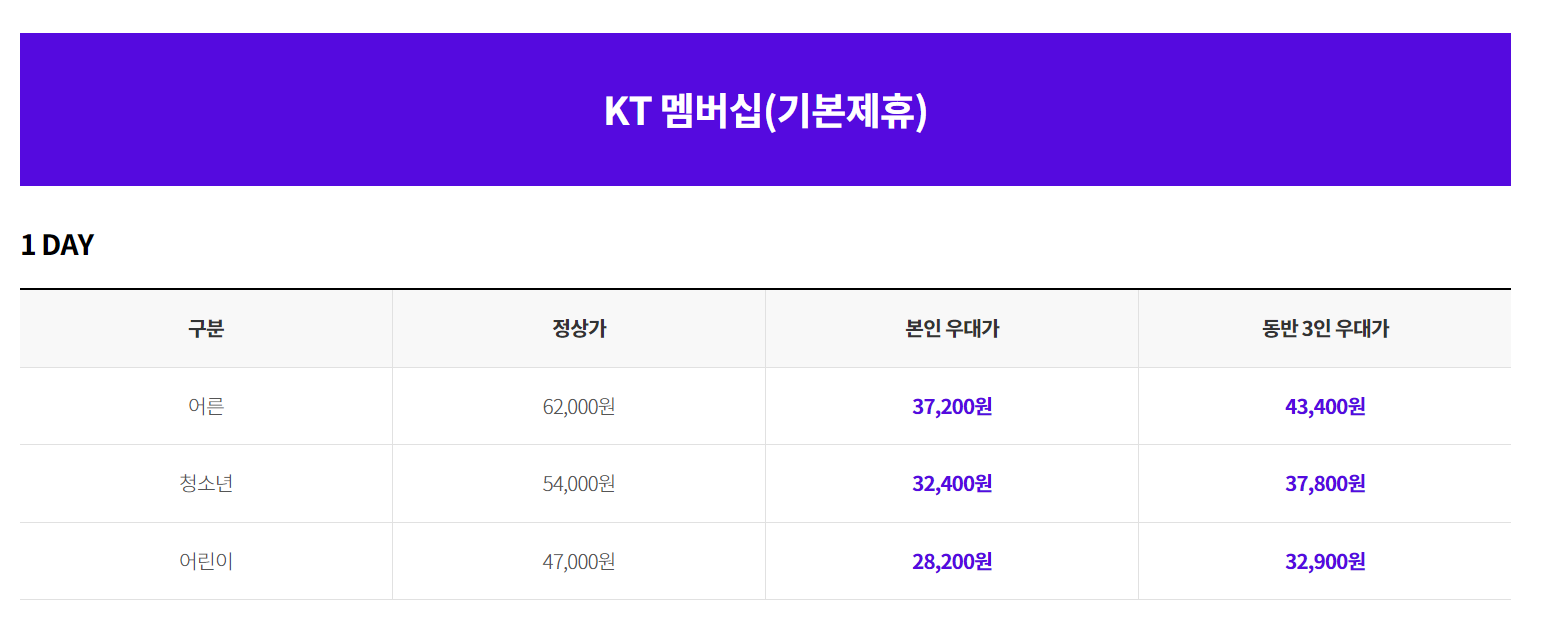 참고로 제휴카드의 경우 이용실적이 충족되어야 할인을 받을 수 있습니다. 제휴카드로 할인을 받는다면 31,000원으로 자유이용권 이용이 가능합니다. 어른의 경우 50% 할인받는 것 같지만 청소년은 42%, 어린이는 카드 있는 경우가 별로 없으므로 패스..입니다.