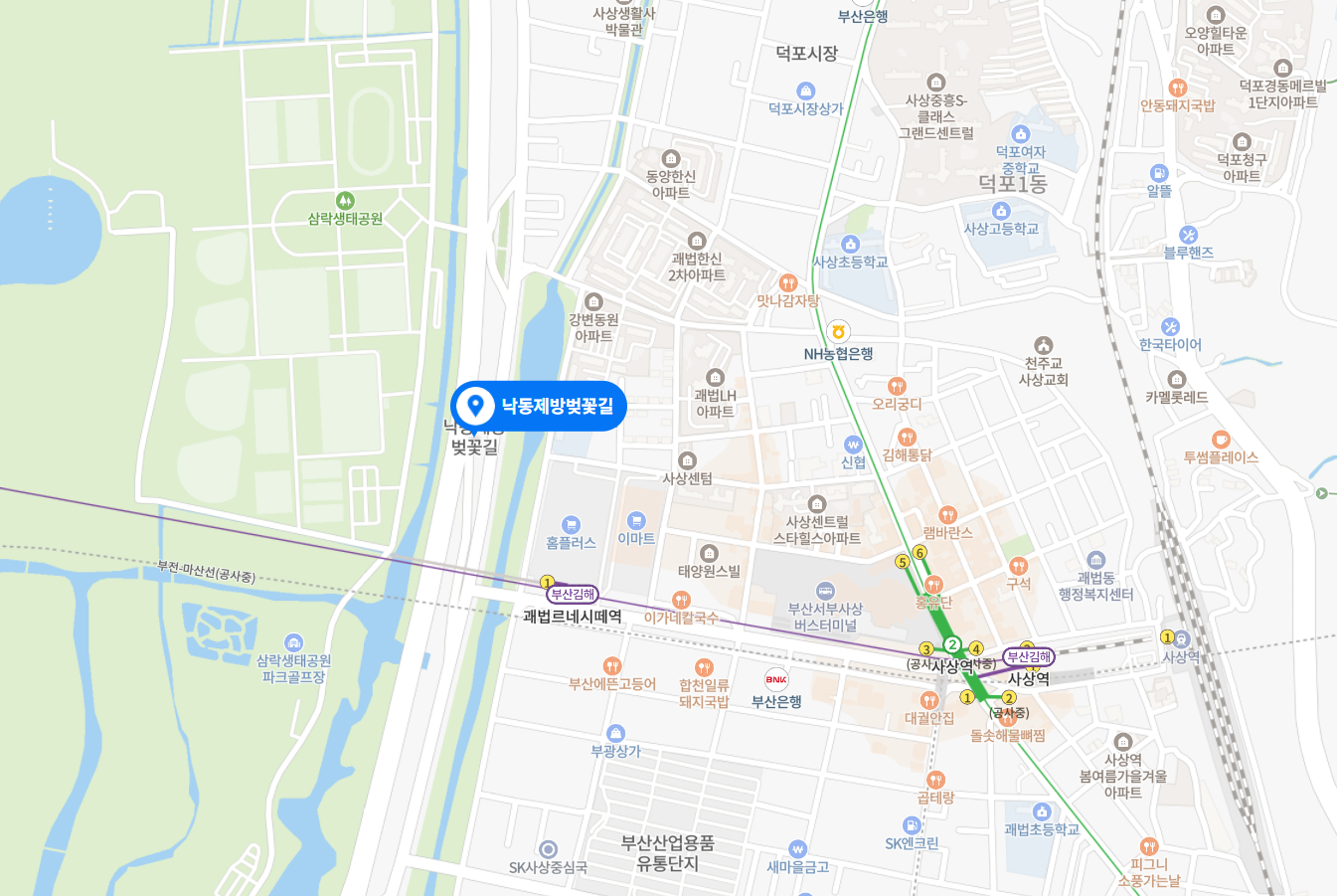 부산 사람들 사이에서도 손에 꼽히는 부산 벚꽃구경 명소이고 먹을거리, 구경거리도 많은데다 낮에는 강물과 함께 다른 꽃들도 보고 해질 무렵에는 노을과 함께 분위기 있는 장소입니다.