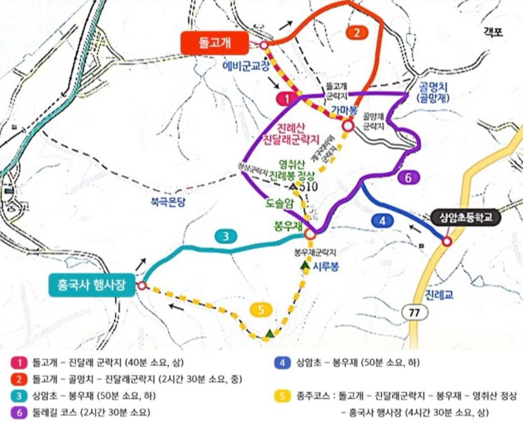 등산코스는 총 6개인데 소요시간은 40분에서 4시간 30분까지 다양합니다. 가장 빠르게 도착하는 코스를 알려드리자면 흥국사 행사장에서 가는게 40분으로 제일 빠릅니다. ^^